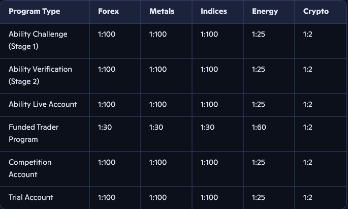 Please be advised of the latest updates to our leverage settings across all offered programs and asset classes. Kindly refer to the table below for the specific leverage ratios applicable to each account type: